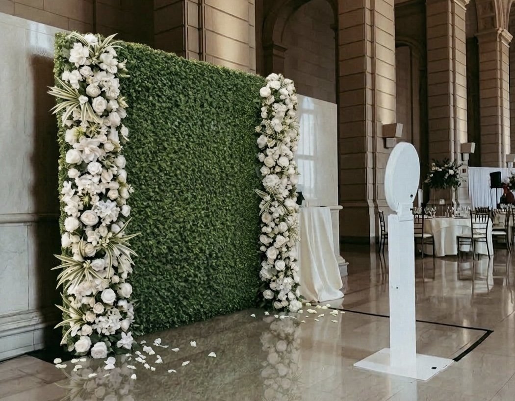 Our Photo Booth offers a simple modern experience your guests will love. Featuring a sleek iPad camera system and ring lighting, every photo is beautifully illuminated. Guests step in front of a 10’x10’ greenery backdrop, creating the perfect setting for fun, candid moments and memorable keepsakes.